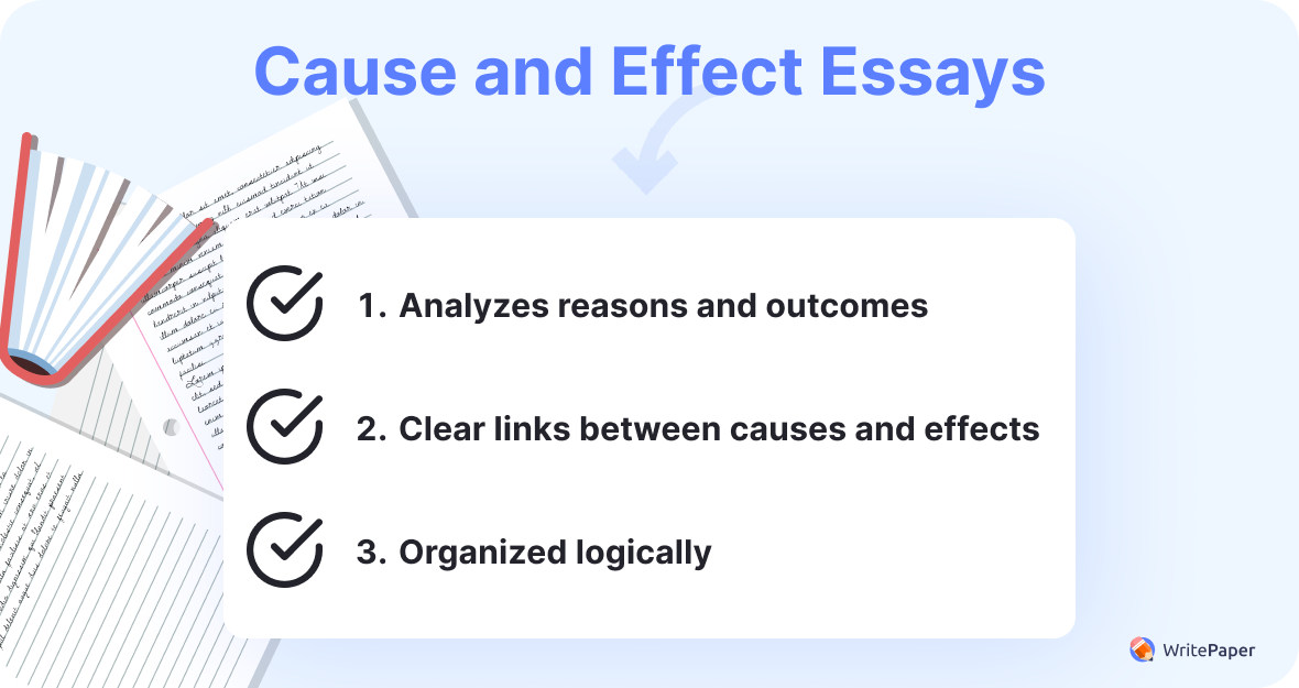 Cause and effect essays explore the reasons behind a particular event or situation (cause) and the resulting consequences or outcomes (effect). The purpose is to analyze the connections and relationships between events.
